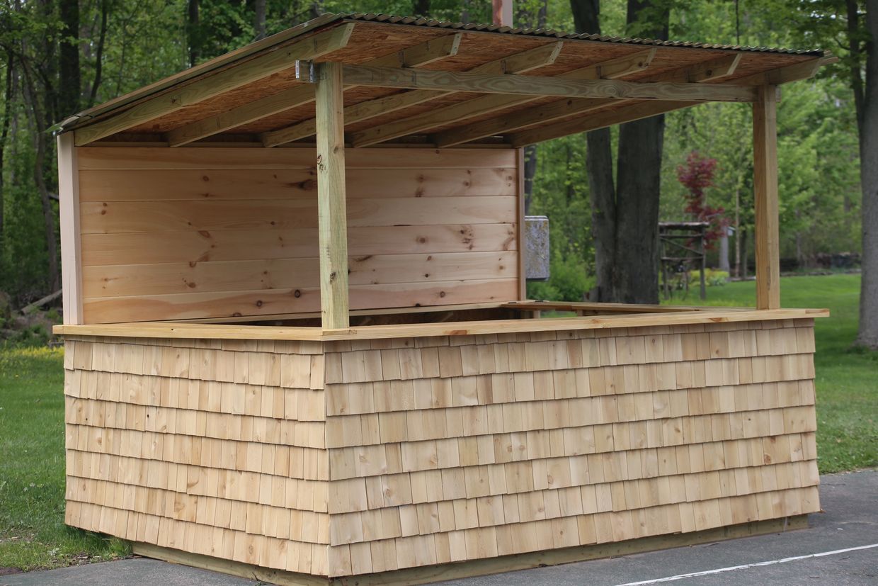 At BackyardBars, our mission is to provide high-quality bars for you! Our bars are all 10' x 8', allowing plenty of space to invite over your friends and family. With a 16" Bar top that surrounds 3 sides of the bar you have plenty of space for you and your drinking buddies. The Bar top is made out of Pine Common Board that is coated 3 times with an exterior poly urethane. BackyardBars are designed so that you can sit inside the bar and enjoy the scenic view of your yard, or have your friends belly up to the bar where you can serve them. The building materials are all made out of pressure treated lumber to protect against the elements to ensure that your bar is made to last. The back of the bar includes a 7" shelf with a shiplap wall that gives it a nice Adirondack feel. 3 different siding options are available: White Cedar Shingles, Shiplap Board, or Outdoor Smart Side Siding. What makes BackyardBars unique is that the bars are built on a deck platform so that the bars can be placed anywhere you want! We place pavers below the deck to ensure that it is level with no digging required. Our process at BackyardBars is very simple: You select what kind of siding you would like and where you would like your bar, sit back and relax while we build it on site in a couple of days (fully insured), then you get to enjoy your very own bar. The best part after is designing and decorating your bar to any theme that you want!